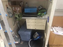 Container de atelier, dimensiuni exterioare LxIxH aprox. 115 x 150 x 200 cm, banc de lucru interior, cu menghină, scară pliabilă, diverse scule mici, cu lacăt.
